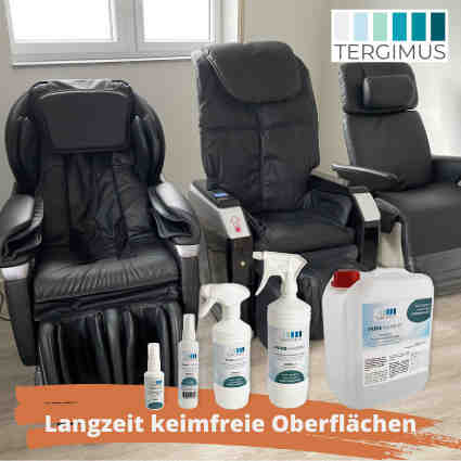 "Wij weten van onze commerciële klanten dat oppervlaktedesinfectie in openbare ruimten zoals ziekenhuizen en sociale instellingen tijdrovend en kostbaar is. Dit is ook een probleem in sportscholen, ontvangstruimtes of ontspanningseilanden in bedrijven", weet Roedeske. "Ontsmetting na elk gebruik is tijdrovend en niet geschikt voor dagelijks gebruik. Zonder geschikte hygiëneproducten zou deze markt voor ons volledig zijn ingestort", weet hij zeker. In zijn zoektocht naar een geschikt product voor de oppervlakken van de massagestoelen, stuitte hij op het bedrijf TERGIMUS genoemd naar de Latijnse term tergere = reinigen. Beide bedrijven zijn begaan met gezondheid en duurzaamheid, dus een samenwerking lag voor de hand. Het PUREMANENT medisch reinigingsmiddel wordt geproduceerd op basis van water en het is de bedoeling het ook af te vullen in flessen van marien plastic.